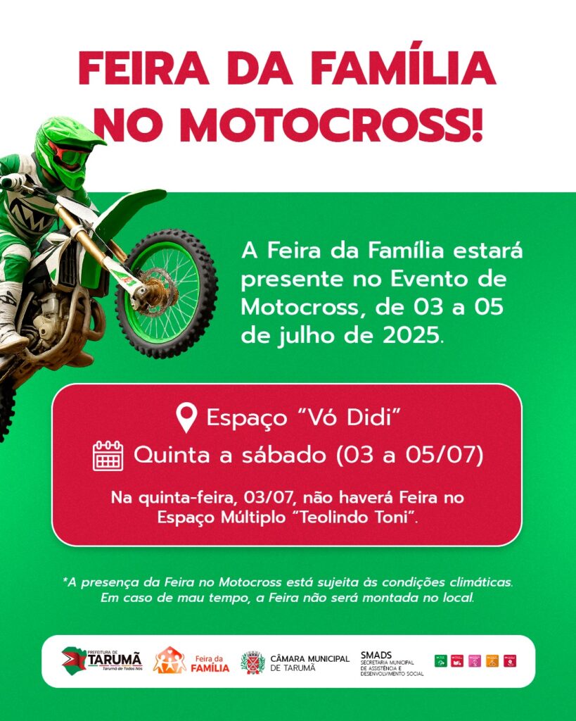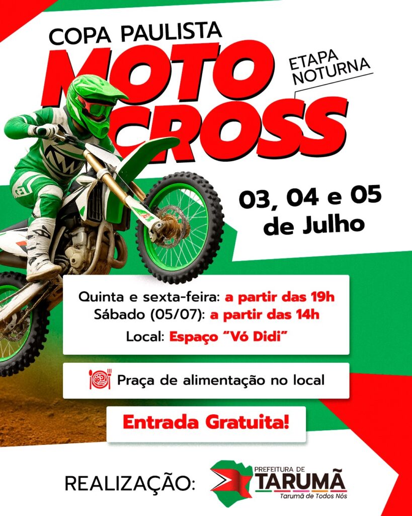 O município de Tarumã recebe nesta quinta-feira, 3 de julho, etapa da Copa Paulista de Motocross, evento que promete movimentar a cidade com adrenalina, velocidade e manobras radicais. A competição será realizada no tradicional espaço “Vovó Didi”, localizado entre a Avenida Paranapanema e a Rodovia Tarumã/Maracaí.