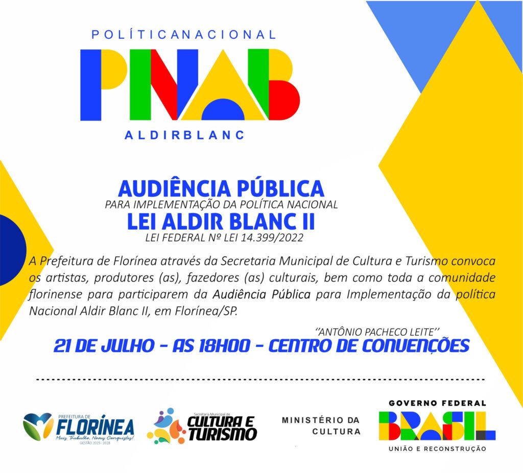 A Prefeitura de Florínea, por meio da Secretaria Municipal de Cultura e Turismo, convoca os artistas, produtores e produtoras, fazedores e fazedoras de cultura, bem como toda a comunidade florinense para participarem da Audiência Pública para Implementação da Política Nacional Aldir Blanc II (PNAB), que acontecerá no dia 21 de julho, às 18 horas, no Centro de Convenções ‘’Antônio Pacheco Leite’’.