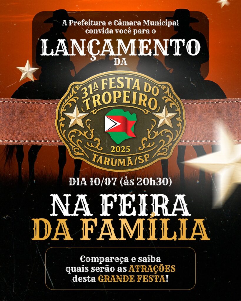 Começa hoje a 1ª Festa Julina da Família de Tarumã, promovida pela Feira da Família em parceria com a Prefeitura Municipal. O evento ocorre nos dias 10 e 11 de julho, no Espaço Múltiplo “Teolindo Toni”, reunindo cultura, gastronomia e entretenimento para todas as idades. E como grande destaque dessa primeira noite ocorre o lançamento da 31ª Festa do Tropeiro e as atrações que farão parte do evento.