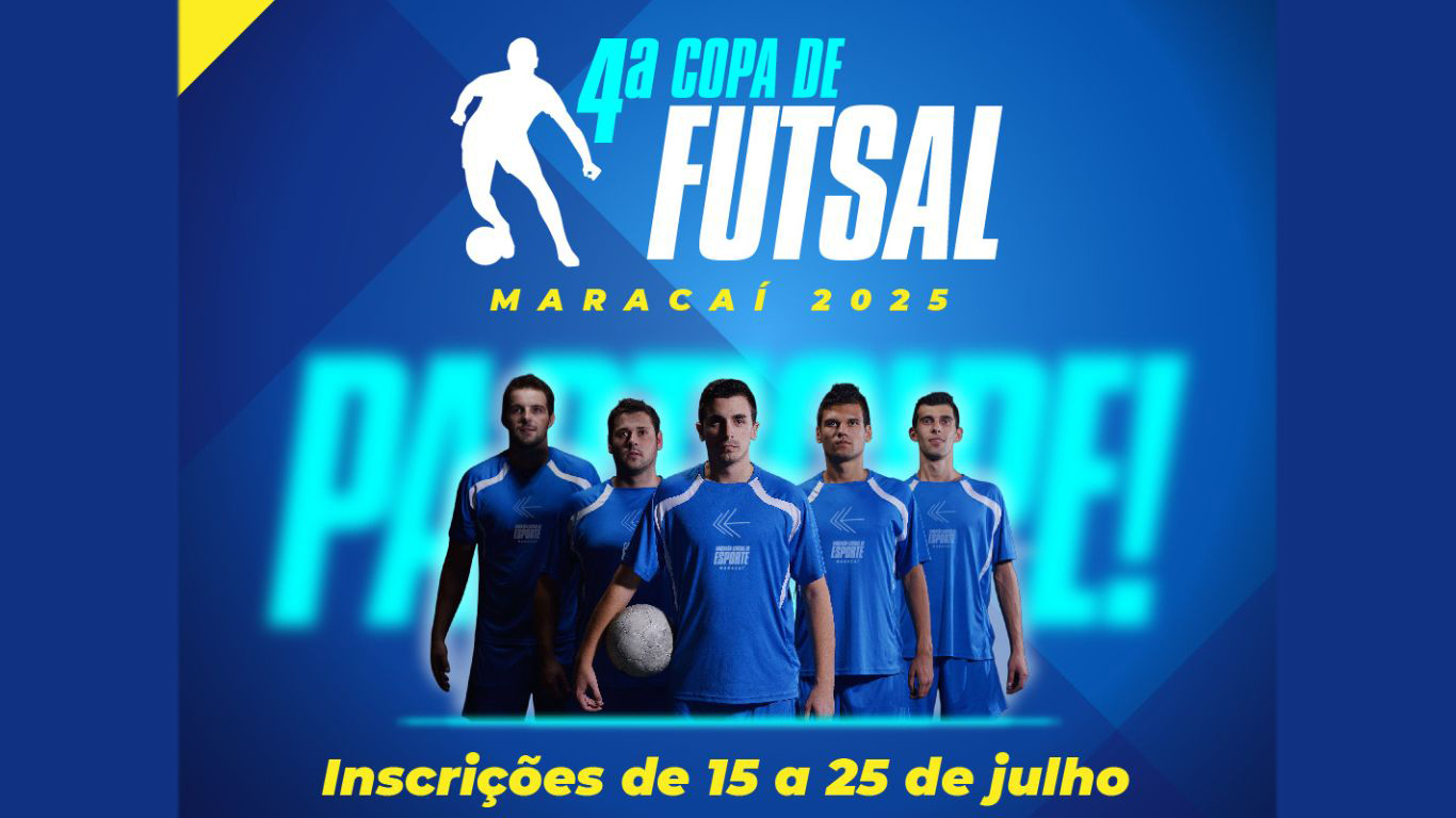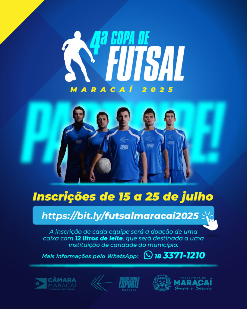 A Prefeitura de Maracaí anunciou que começam hoje, dia 15 de julho, as inscrições para a 4ª Copa de Futsal do município. As equipes interessadas podem garantir participação até o dia 25 de julho, mediante inscrição on-line. As vagas são limitadas e seguem a ordem de confirmação.