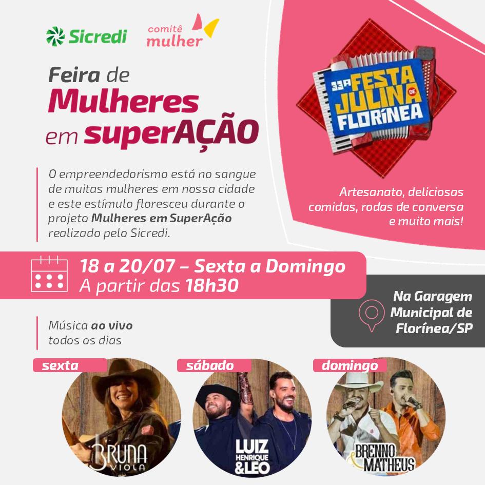 Além da Feira das Mulheres Empreendedoras, a 33ª Festa Julina de Florínea contará com apresentações culturais, comidas típicas, barracas tradicionais e shows com Bruna Viola, Luiz Henrique & Leo e Brenno & Matheus. A comunidade de Florínea e região está convidada a participar desta grande festa e prestigiar as mulheres empreendedoras de Florínea, contribuindo para o fortalecimento da economia e o desenvolvimento social do município.