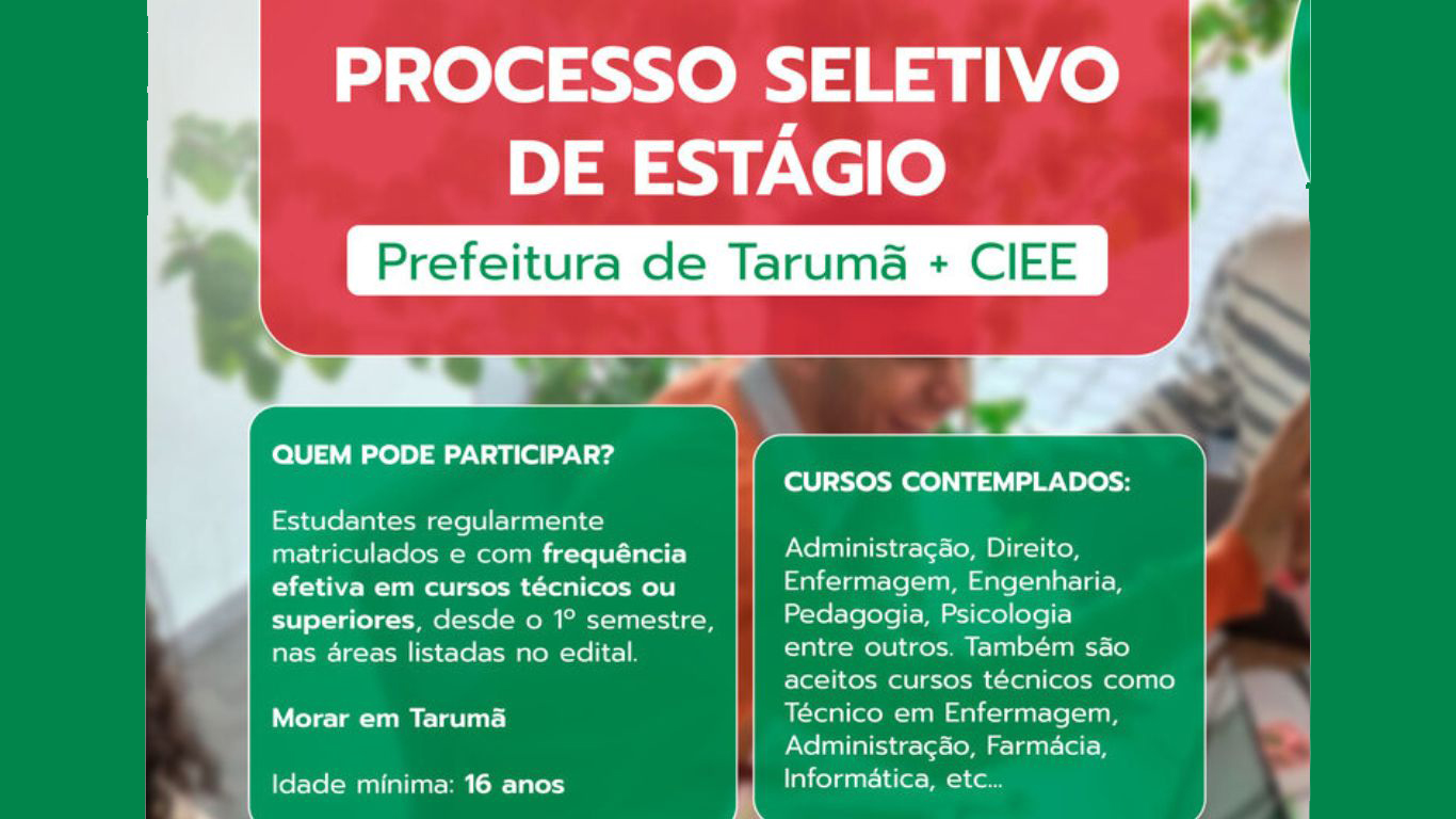 A Prefeitura Municipal de Tarumã, em parceria com o CIEE – Centro de Integração Empresa-Escola, informa que estão abertas as inscrições para o Processo Seletivo de Estagiários – Edital nº 71/2025. O objetivo é formar cadastro reserva para diversas áreas de atuação em estágio, tanto de nível técnico quanto superior.