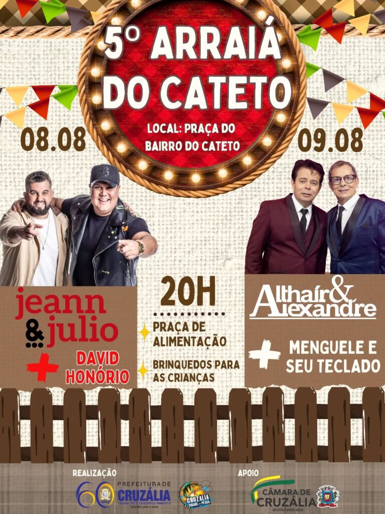 Além das atrações musicais, o evento contará com praça de alimentação, brinquedos para as crianças e uma estrutura completa pensada para garantir conforto, segurança e diversão ao público. O 5º Arraiá do Cateto deve moradores do bairro, de Cruzália e visitantes de outras cidades da região, que encontram na festa uma oportunidade de lazer e convivência familiar.