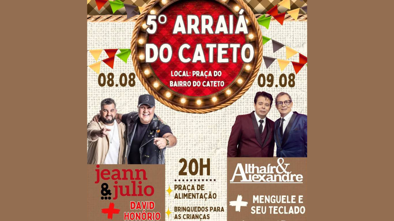 Vem aí o 5º Arraiá do Cateto, evento que será realizado nos dias 8 e 9 de agosto, a partir das 20h, na Praça Central, e promete reunir a comunidade em duas noites de muita música, comidas típicas e diversão para todas as idades.