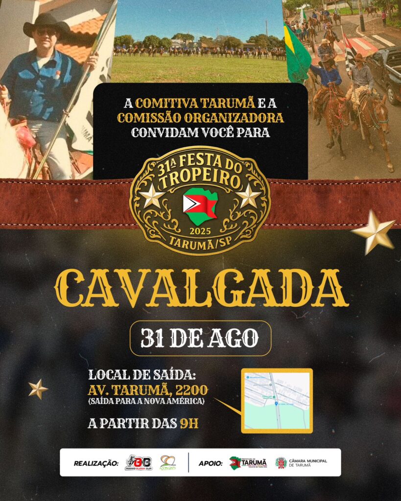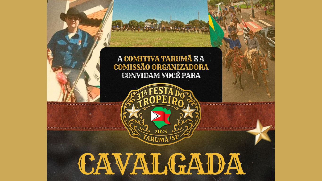 A tradicional Cavalgada da Festa do Tropeiro, em Tarumã, já tem data definida. O evento, que abre oficialmente a programação da festa mais importante do calendário cultural do município, será realizado no domingo, 31 de agosto.