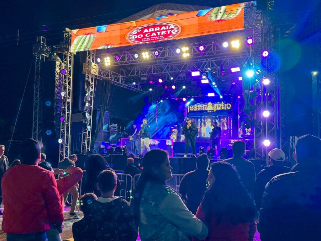 A primeira noite do 5º Arraiá do Cateto, realizada ontem, foi um sucesso de público e animação. O evento, que já se tornou tradição na comunidade, reuniu moradores, visitantes e famílias inteiras em um ambiente de confraternização. A programação da noite começou com o show de David Honório, que embalou o público com um repertório de música sertaneja raiz. Em seguida, a dupla Jeann & Julio subiu ao palco, levando sucessos sertanejos e conquistando a plateia com energia e carisma, encerrando a noite em alto astral.