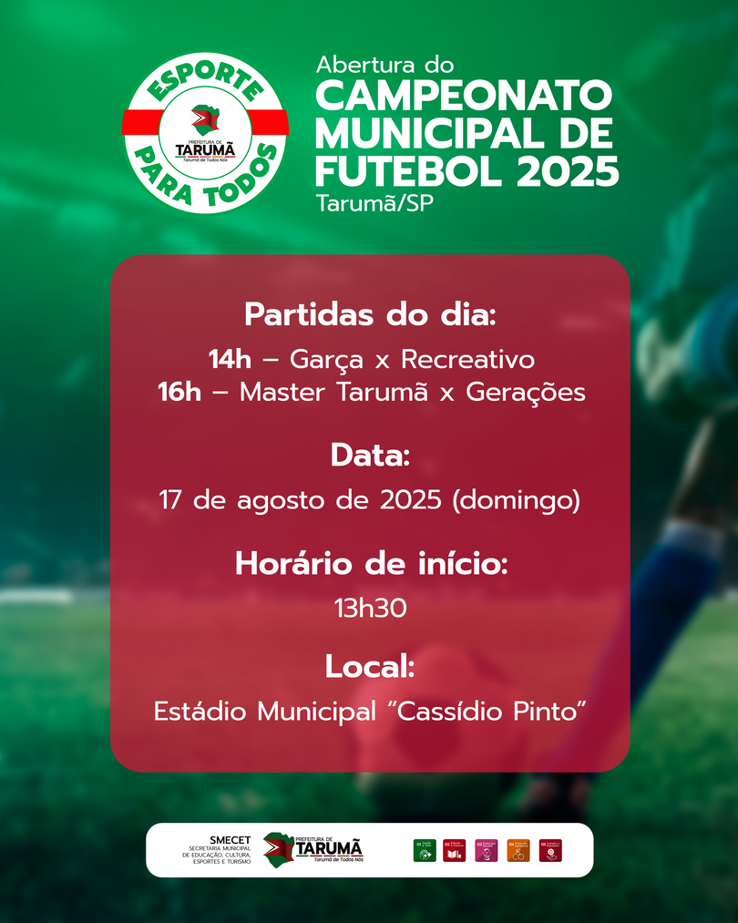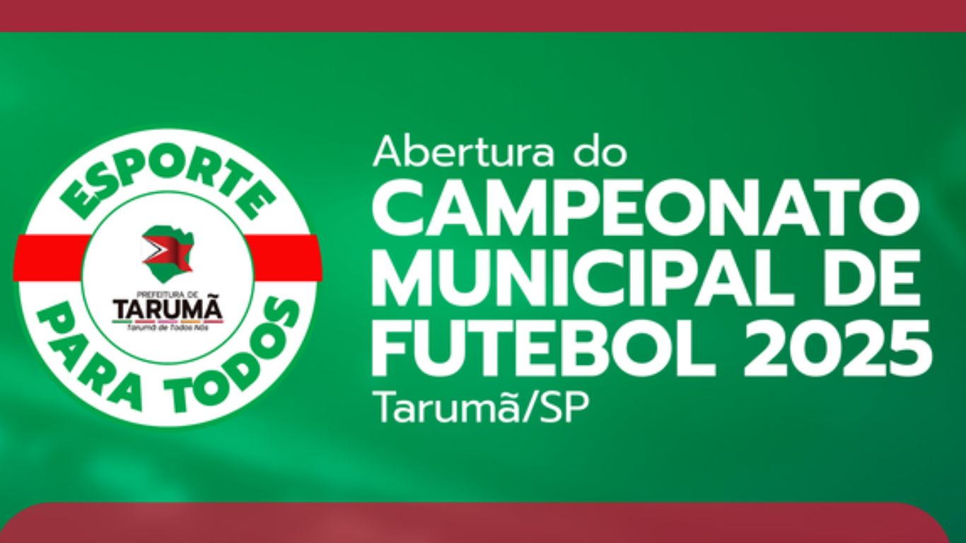 A Prefeitura de Tarumã realiza, no próximo domingo (17), a abertura oficial do Campeonato Municipal de Futebol 2025. A cerimônia e os primeiros jogos da temporada vão ocorrer no Estádio Municipal Cassídio Pinto, a partir das 13h30.