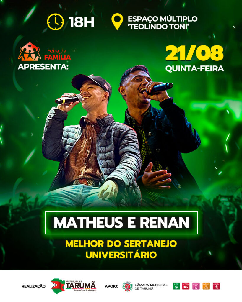 A Prefeitura Municipal de Tarumã, em parceria com a Feira da Família, realiza nesta quinta-feira, 21 de agosto, uma noite especial no Espaço Múltiplo “Teolindo Toni”, a partir das 18h. O evento tem como objetivo oferecer lazer, cultura e entretenimento para toda a comunidade, além de valorizar os talentos locais e fortalecer o comércio da cidade.
