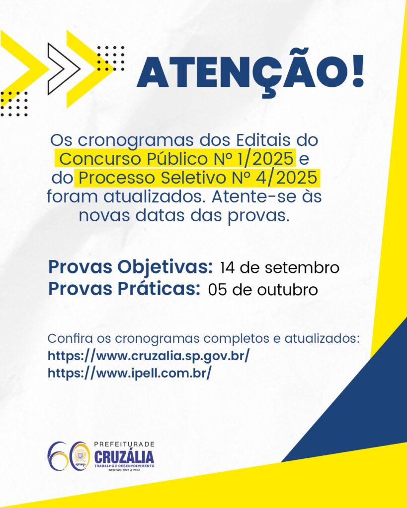 A Prefeitura de Cruzália anunciou a atualização dos cronogramas referentes ao Concurso Público nº 1/2025 e ao Processo Seletivo nº 4/2025. As mudanças envolvem as datas de aplicação das provas objetivas e práticas, que foram redefinidas para o mês de setembro e outubro.