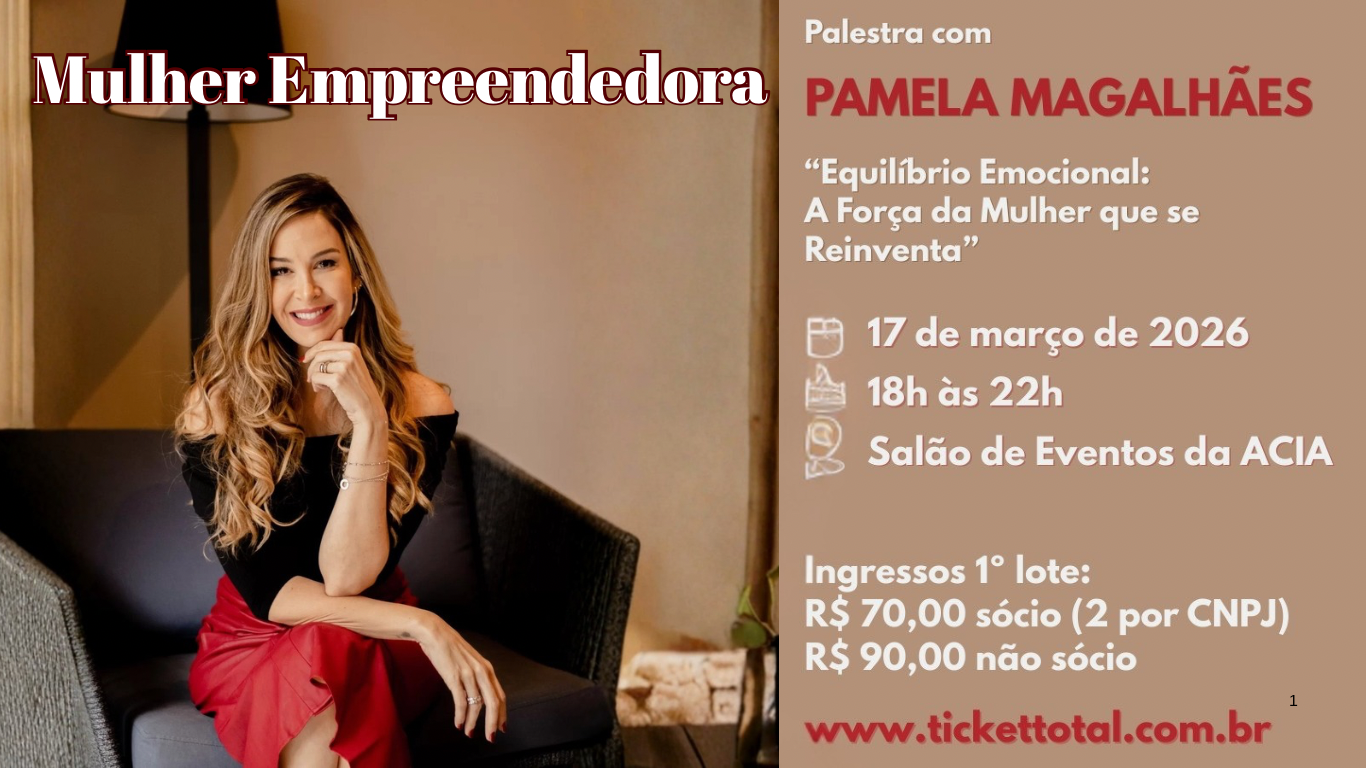 ACIA INICIA VENDAS DE INGRESSOS PARA O EVENTO MULHER EMPREENDEDORA COM PALESTRA DE PAMELA MAGALHÃES