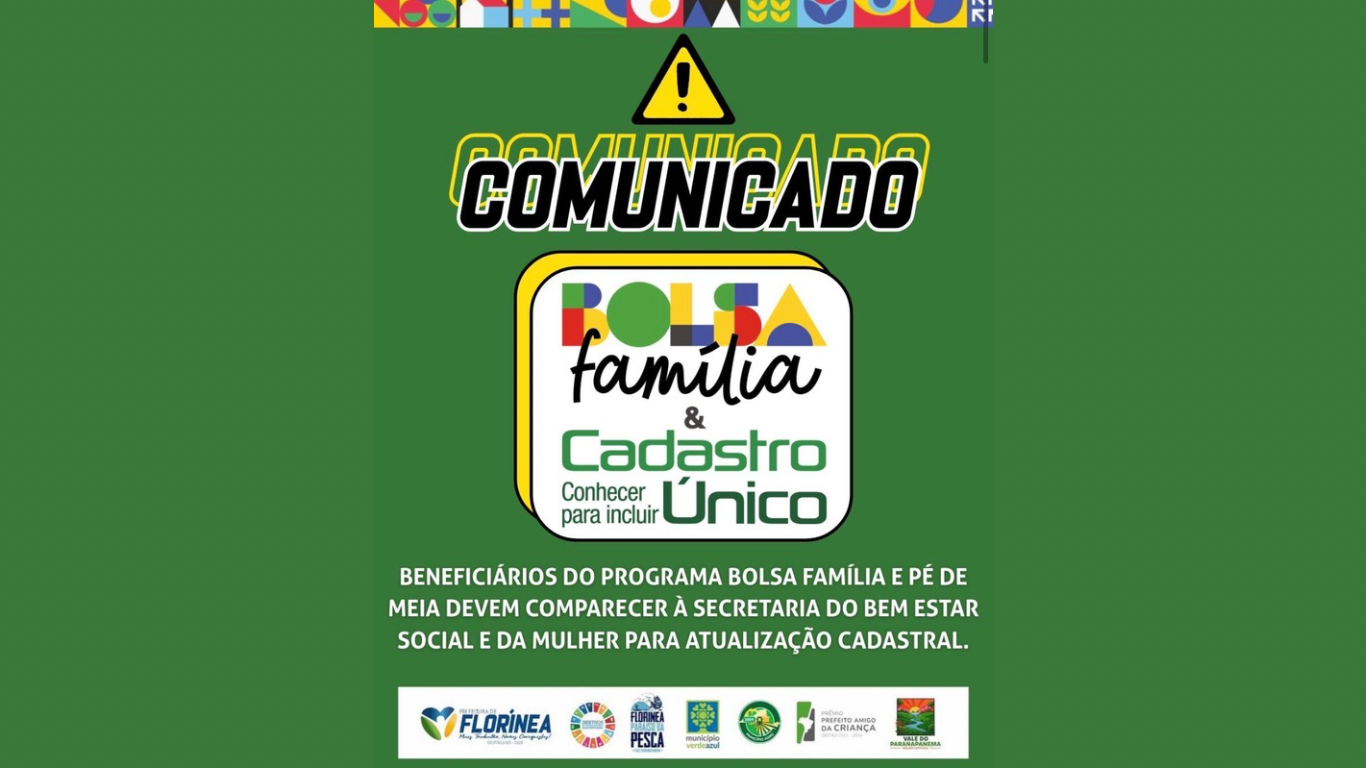 A Prefeitura de Florínea orienta os beneficiários dos programas Bolsa Família e Pé-de-Meia a realizarem a atualização cadastral, procedimento que tem início nesta terça-feira, 27 de janeiro de 2026.