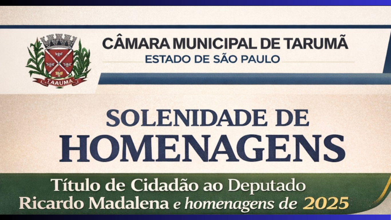 A Câmara Municipal de Tarumã promoverá, no próximo dia 27 de março de 2026, às 19 horas, no Centro Integrado de Educação e Cultura (CIEC), uma solenidade especial marcada pela entrega do Título de Cidadão Tarumaense ao deputado estadual Ricardo Madalena, além da entrega de moções e homenagens concedidas ao longo do ano de 2025.