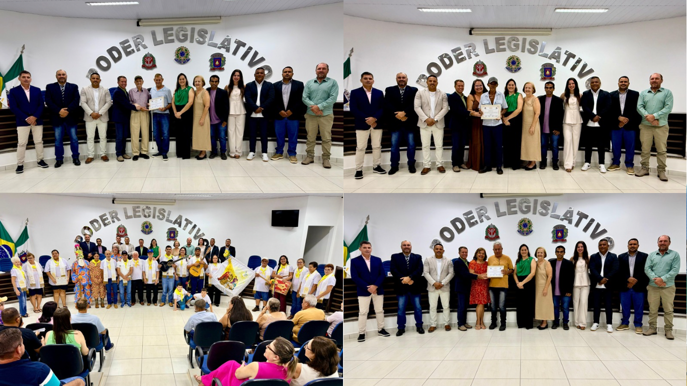 Durante a solenidade, foram homenageados Dimas Effgen, ao lado da tradicional Folia de Reis do Bairro da Pintada, símbolo da cultura e das raízes do município. Também receberam reconhecimento Olindo Totti, Marcos Rogério Cintra e José Lourenço da Silva, todos destacados por suas trajetórias de trabalho, dedicação e compromisso com a comunidade.